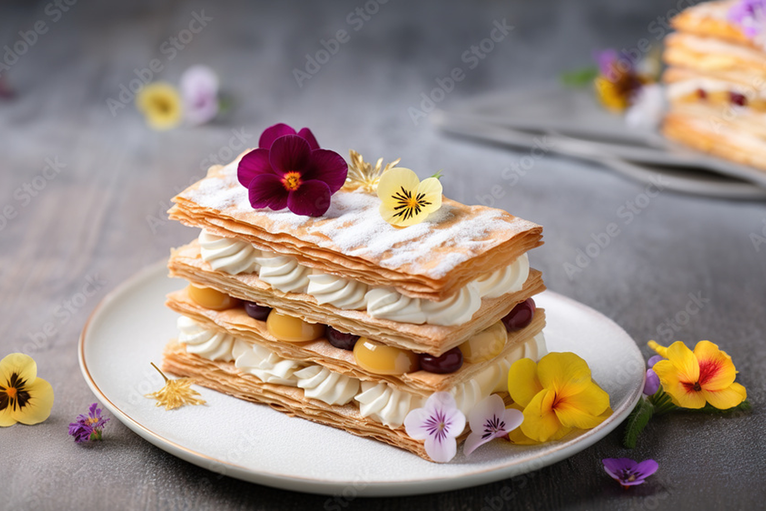 『エディブルフラワーを添えた プレミアム・ミルフィーユ』